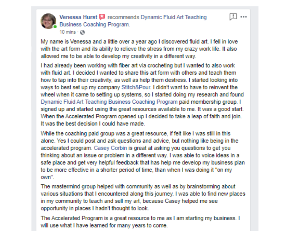 While most coaches can do this for you, Casey is also an expert in the fluid art teaching industry. He quickly built his own paint pouring art workshop business in just a one month. He is an award-winning artist and social media influencer. His rankings with Youtube subs, viral videos, Facebook followers on his specific Groups have credentialed him to be sponsored by art paint companies and receive thousands of dollars of art supplies annually (and you can too! He will share the secrets and connections!)