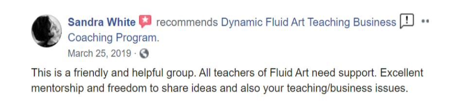One of the big frustrations I hear from creatives in business who are seeing a mentor or coach is that the people offering the artist mentoring haven't actually been successful themselves. They are professional consultants but have never actually made a living doing the stuff! Fluid art teaching business owners who choose to work with me as their mentor really value the fact that I have been and continue to be a successful teaching fluid art and thriving creatively.